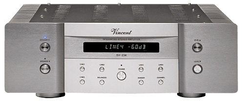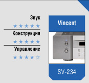 Конструкция. Лицевая панель — наборная из нескольких алюминиевых пластин, тонированных в разные цвета, имеет эффектную окраску «с отливом». Управление громкостью осуществляется в цифровом виде, а посредством моторизованного переменного резистора. Дисплей, индицирующий уровень громкости и выбранный вход, имеет три градации изменения яркости подсветки плюс возможность ее полного отключения. Как и во многих стереоусилителях высокого класса, в SV-234 режима Standby не предусмотрено, поэтому с пульта питание не включается. Судя по заявлениям фирмы, усилитель работает в классе А. Подтверждения этому в описании мы не нашли, но разогреваются радиаторы довольно быстро и весьма ощутимо. В тракте используется мостовая схема, выходной каскад которой собран на биполярных транзисторах 2SA1386 и 2SC3519, специально разработанных для звукоусиления. Для дистанционного включения имеется вход триггера 12 В, а для включения других устройств предусмотрены два 12-вольтовых выхода. Кроме обычных входов, модель оснащена более помехозащищенным и более динамичным симметричным входом. А две пары клемм для акустики облегчают подключение АС по схеме bi-wiring. Помимо регулятора громкости на пульте есть кнопка gain, позволяющая снизить уровень сигнала «скачком» на 8 дБ (приглушить музыку, чтобы, например, ответить на