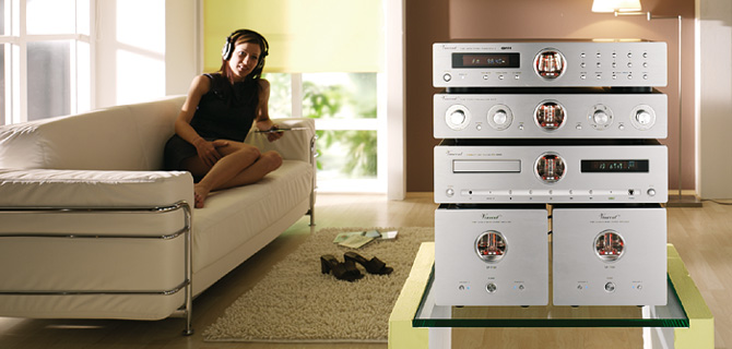 Предварительный усилитель Vincent SA-T1 также собран на двойных триодах, в каскадах усиления установлены лампы 12АХ7, а в выходных буферах — 12AU7. Они расположены ближе к входам для уменьшения возможной длины сигнальных цепей, а выставленная на обозрение лампа 6N4 используется в цепи питания каскадов. Для лучшего экранирования корпус внутри разделен стальными перегородками на три отсека: усилительный, питание и управление. Вся усилительная часть собрана на одной большой печатной плате, расположенной горизонтально. При таком монтаже ламп охлаждение для них (особенно расположенных ближе к середине платы) не самое оптимальное, поэтому для улучшения конвекции в плате вокруг держателей ламп сделано по нескольку отверстий, чтобы воздух свободнее проходил от прорезей в нижней панели. Регулятор громкости выполнен на моторизованном переменном резисторе. Причем он установлен не на лицевой панели, а непосредственно на печатной плате усилительной части. Такая установка позволяет минимизировать длину соединительных проводников и исключить, где это возможно, соединение проводами, — все это снижает наводки и уменьшает количество переходных соединений и паек. При изменении громкости на ручке регулятора загорается краснооранжевый светодиод, по которому с любого расстояния легко определить положение регулятора. SA-T1 оснащен и регуляторами тембра, которые также выполнены на потенциометрах, правда, уже не моторизованных, поэтому возможность регулировки тембра с пульта отсутствует. Переменные резисторы имеют фиксированное среднее положение, облегчающее установку гладкой частотной характеристики. Отключение тембров также присутствует. Кроме тембров, есть и отключаемая фиксированная тонкомпенсация. А отсутствие регулятора баланса накладывает несколько большие требования на точность подбора коэффициентов передачи в каналах. На селекторе входов и разъемах все источники сигнала называются S1…S6. Переключение входов выполнено на реле, как в большинстве моделей такого класса. Из имеющихся трех выходов один предназначен для подключения внешних записывающих устройств. Напомним, что его отличие от других заключается в том, что на него не влияет регулятор громкости. Сетевой трансформатор выполнен на П-образном сердечнике, но в сечении сердечник круглый, что позволяет исключить острые перегибы провода при намотке. Также это упрощает изготовление обмоток, так как они здесь делаются отдельно на цилиндрических каркасах и при сборке просто надеваются на сердечник.