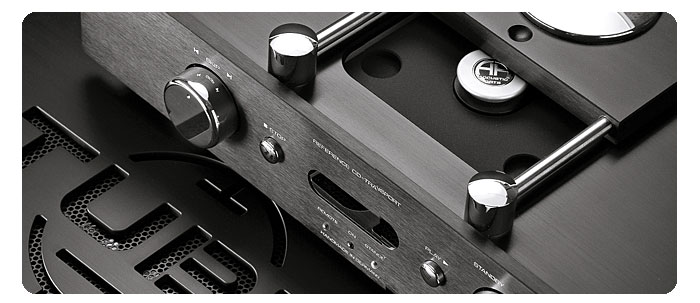 В обновленном комплекте двухблочного CD-проигрывателя, который стал материализовавшимся результатом десятилетних исследований и разработок, внешне наибольшим изменениям подвергся блок транспорта DRIVE II. Поскольку теперь для доступа к приводу нужно сдвигать крышку, расположенную не под верхней панелью, а на ней, то панель усилили. На ней закреплены впечатляющие направляющие (у предшествующих моделей они были спрятаны внутри), по которым и сдвигается массивная (толщиной 20 мм) алюминиевая крышка отсека загрузки. Исчезла оригинальная подсветка, но добавилось хромированных деталей. Кстати для поддержания их в идеальном состоянии в комплект входит салфетка из специальной микроволоконной ткани. Что касается ЦАП’а, то у него появилась очень эффектная верхняя панель с вырезанным условным обозначением лампового триода с отражающей его суть надписью вместо сетки — TUBE. Дизайнерское решение уже с успехом опробованное на фирме: подобными панелями, но естественно с другими надписями, щеголяют усилители мощности Accustic Arts. В связи с тем, что толщина верхних алюминиевых панелей увеличена до 8 мм, из такого же материала сделаны и боковые стенки, к которым они крепятся болтами. Для уменьшения помех от механической вибрации верхняя панель и крышка отсека загрузки транспорта внутренне задемпфированы.